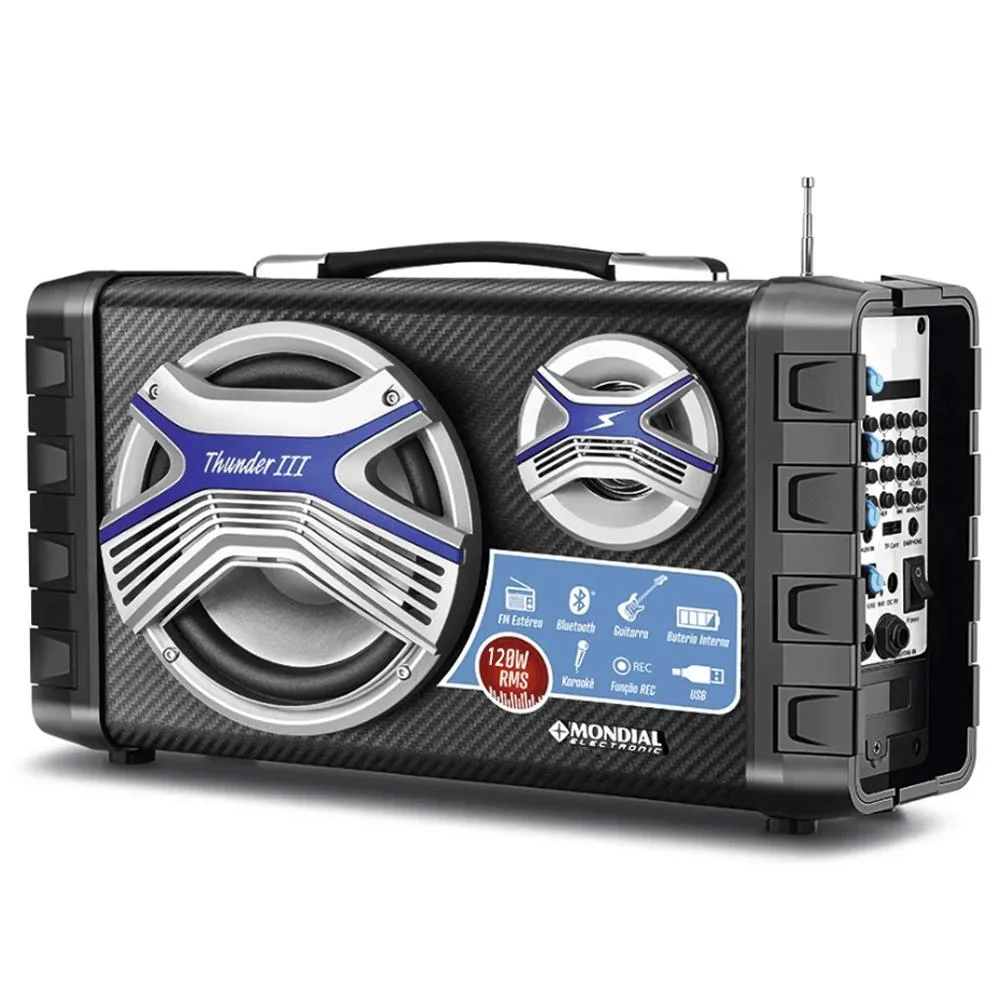 Marca: Mondial Modelo: MCO-13 Potência: 120W Cor: Preto Tecnologia: Bluetooth® FM USB SD Card Entrada para Microfone e Instrumentos Musicais Display digital e bateria interna recarregável Voltagem: Bivolt Itens Inclusos: Caixa Alça Microfone Manual Dimensões da Embalagem: Altura: 26cm Largura: 46cm Profundidade: 16cm Peso: 3,081kg Garantia: 12 meses